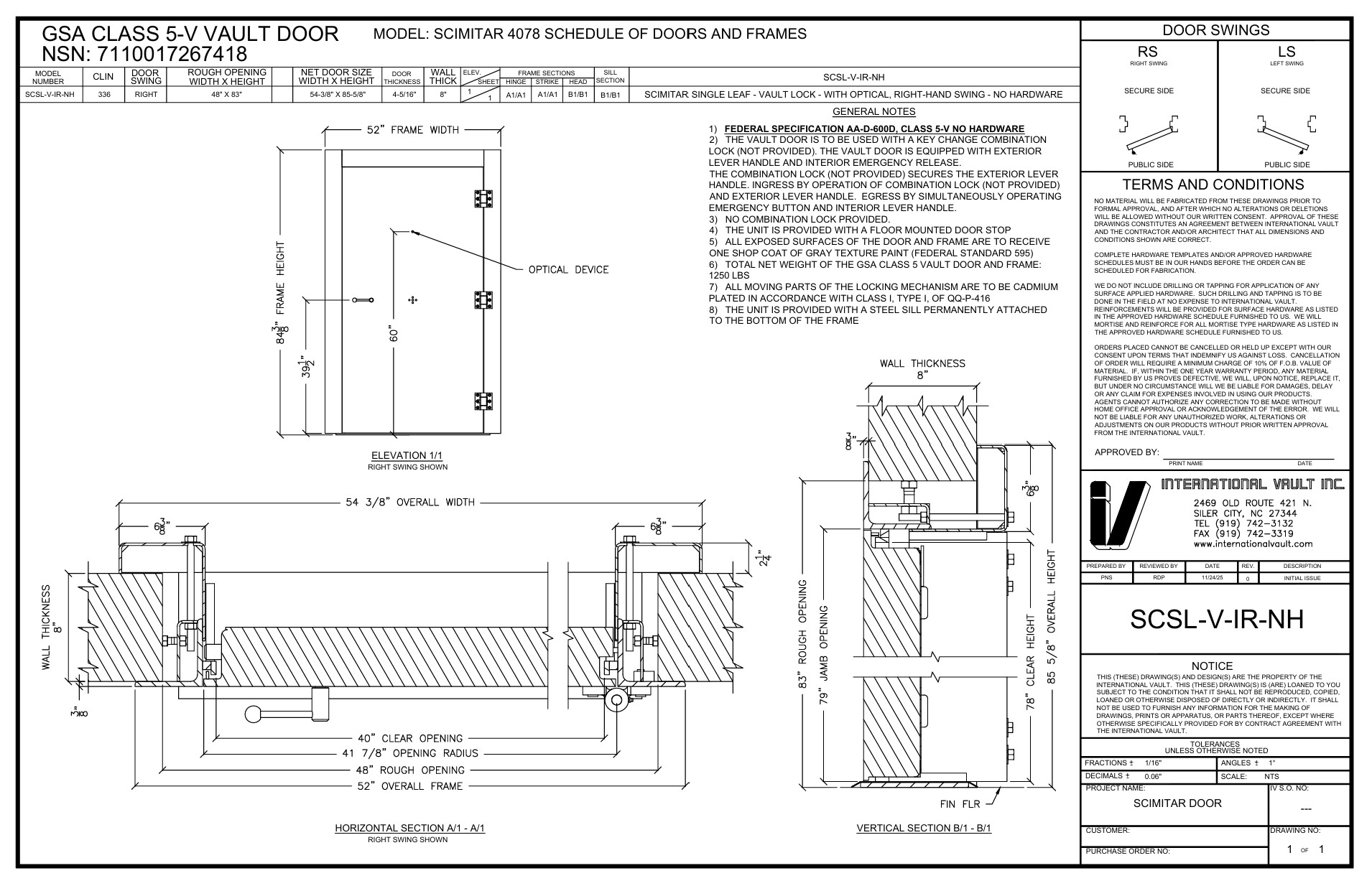 As a GSA contract awardee for Solicitation 47QSSC-25-R-3040N, International Vault boasts 20 new National Stock Numbers for Vault Doors compliant with AAD-600D available for purchase through the GSA Schedule. The SCSL-V-IR-NH model listed below complies with stringent GSA specifications and standards.